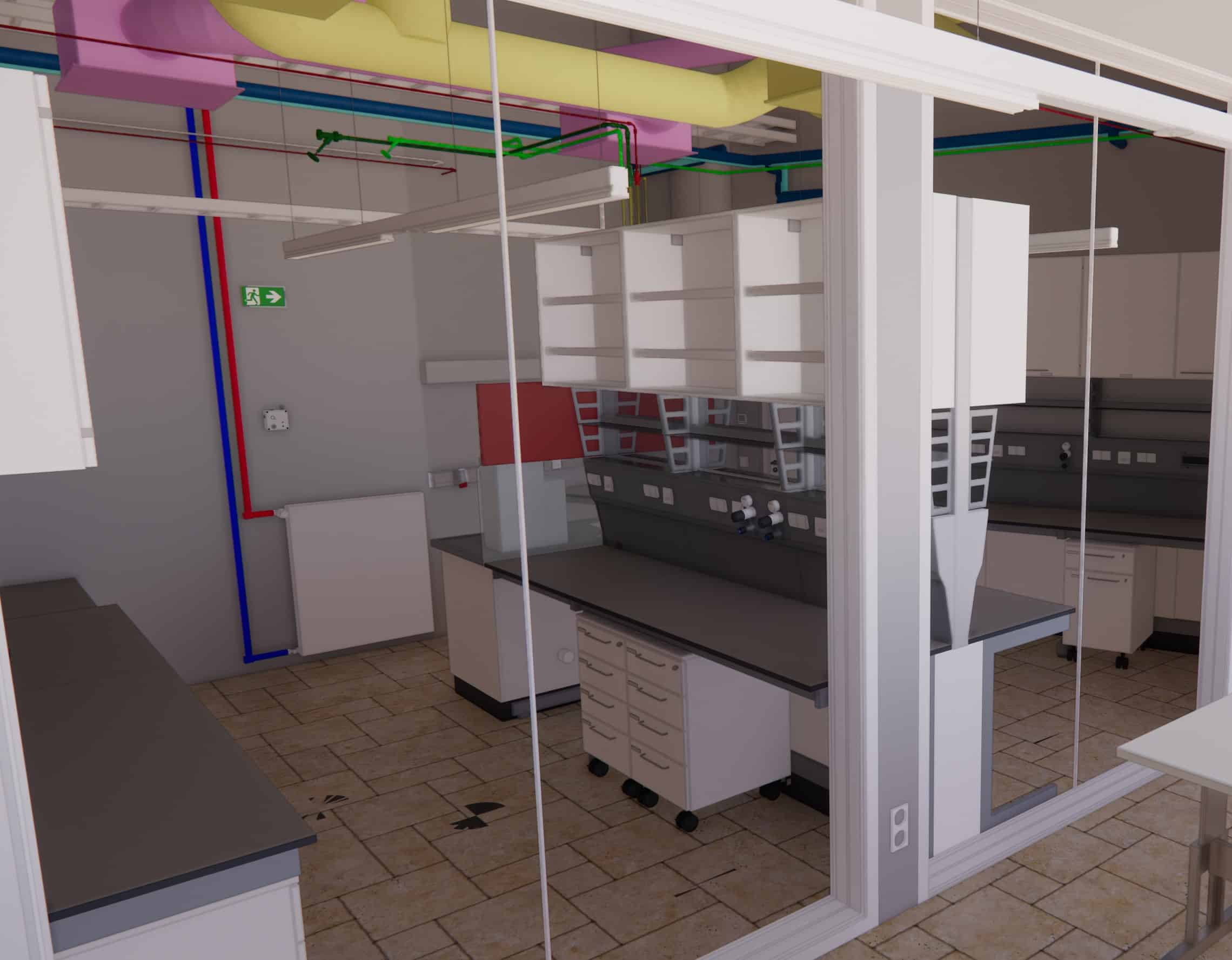 Die Maßnahme beinhaltet die umfassende Adaptierung der Laborräume und technischen Gebäudeausrüstung, einschließlich neuer Lüftungs‑, Abluft‑ und Versorgungssysteme sowie aller erforderlichen sicherheitstechnischen Einrichtungen.